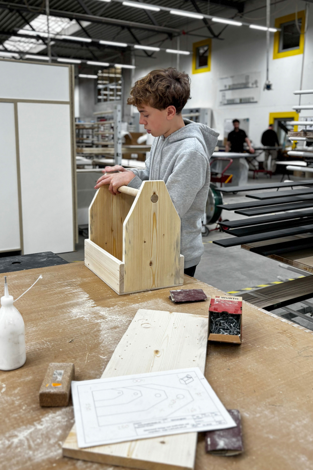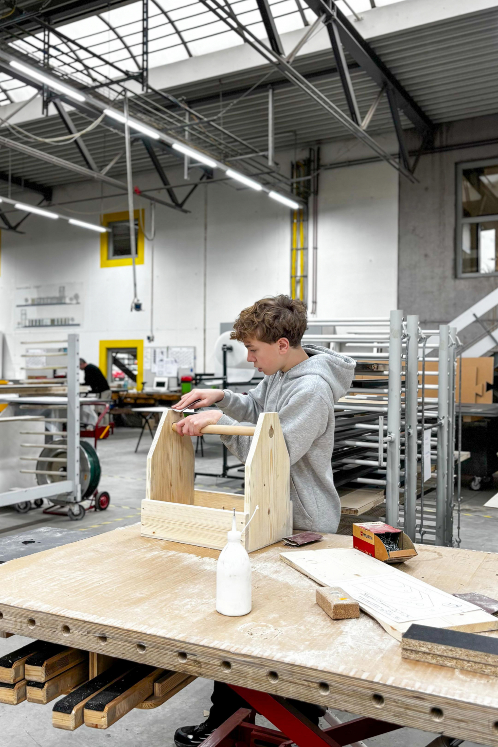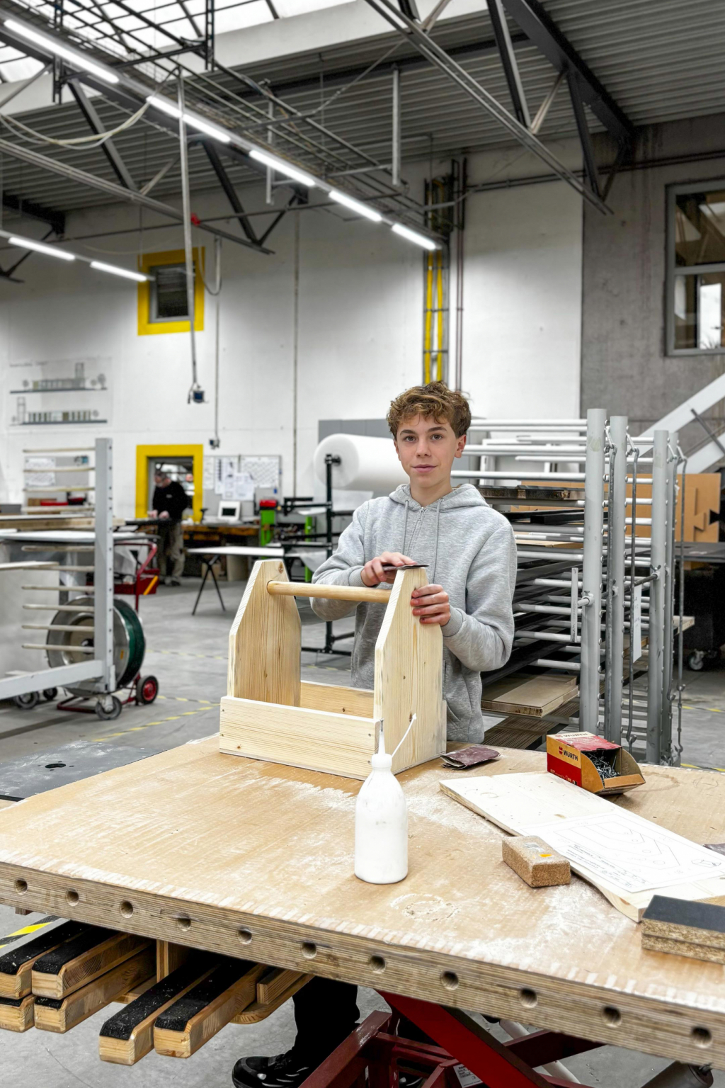Antoine war währenddessen in unserer Schreinerei im Einsatz. Mit Unterstützung unseres Ausbildungsleiters Malte und unserer Auszubildenden Linda entstand Schritt für Schritt sein ganz eigenes Projekt: ein Werkzeugkasten aus Massivholz.