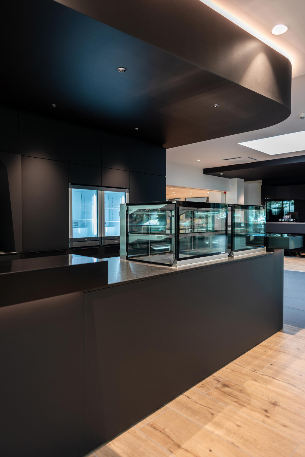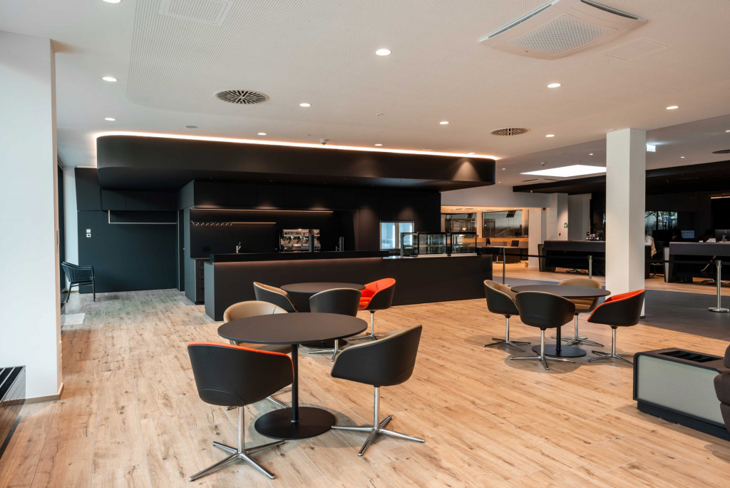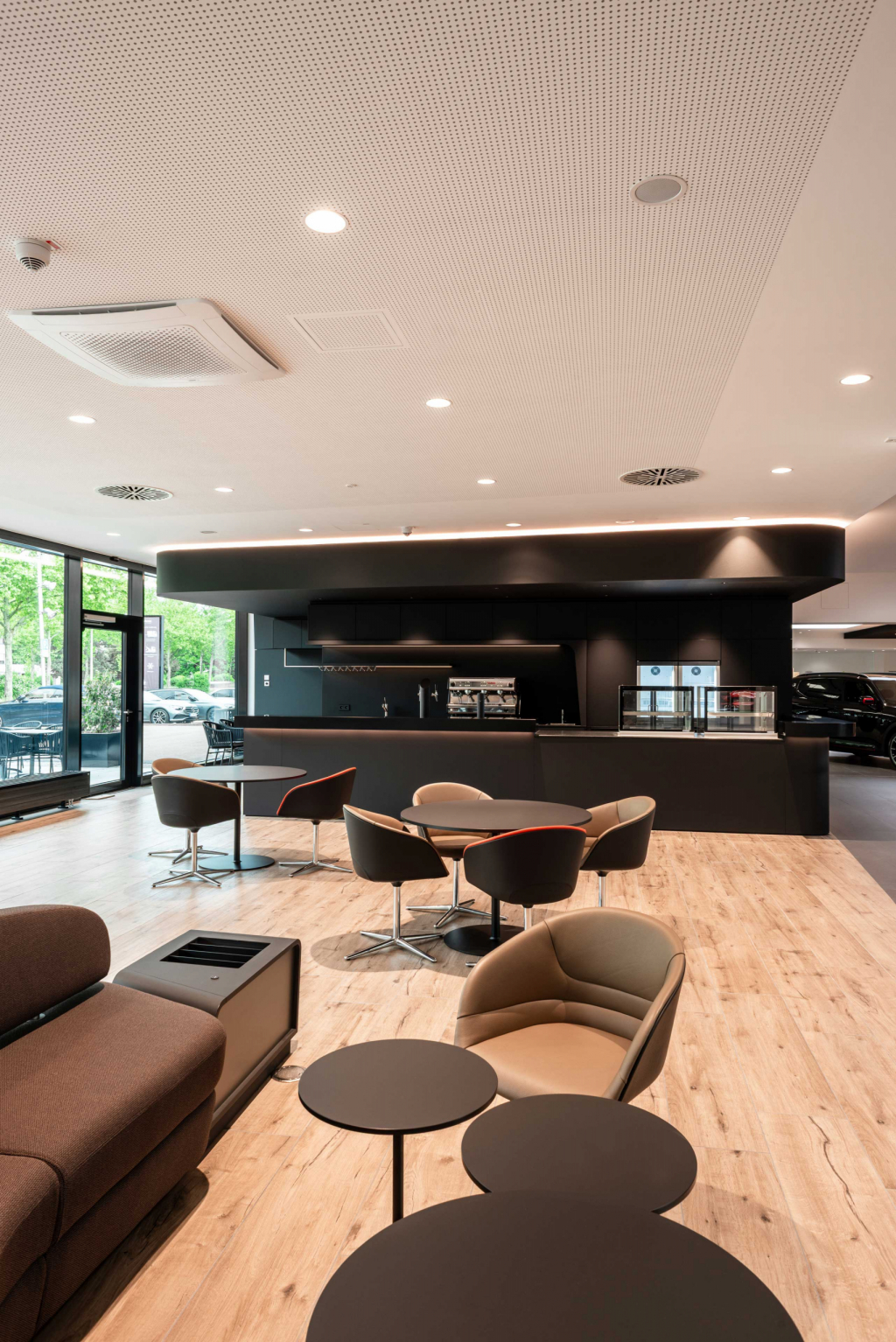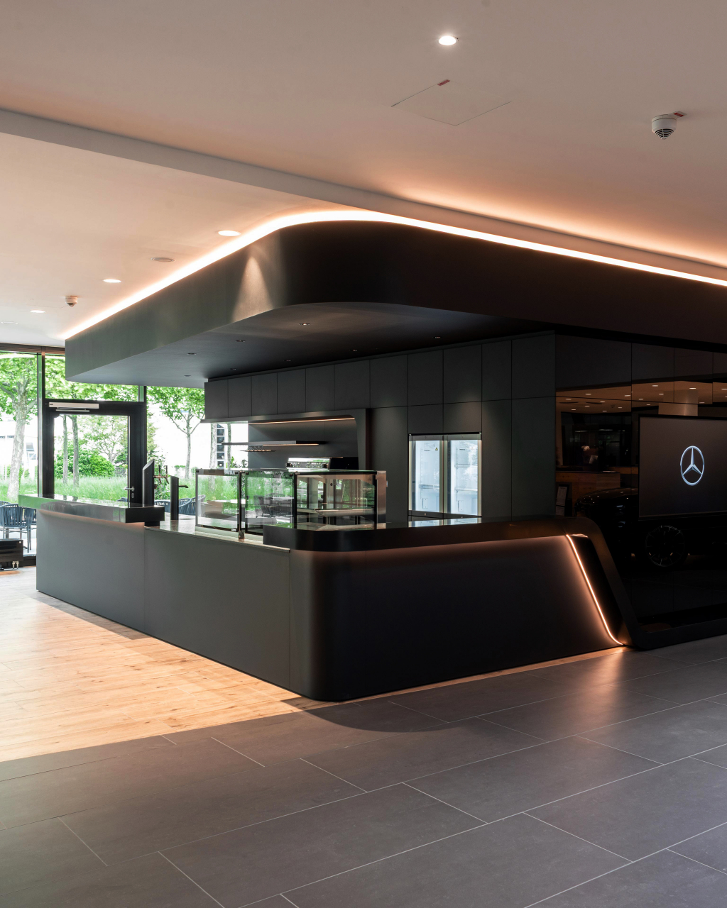 Mitten im Freiburger Mercedes Benz Autohaus Kestenholz haben wir auf 50  m² einen Ort realisiert, an dem man gern verweilt – ob beim kurzen Kaffee-Stopp oder für ein Kundengespräch in entspannter Atmosphäre. Die Kombination aus edlen Materialien, geschwungener Formensprache und funktionalem Innenleben macht das Bistro zu einem echten Eyecatcher im Showroom.