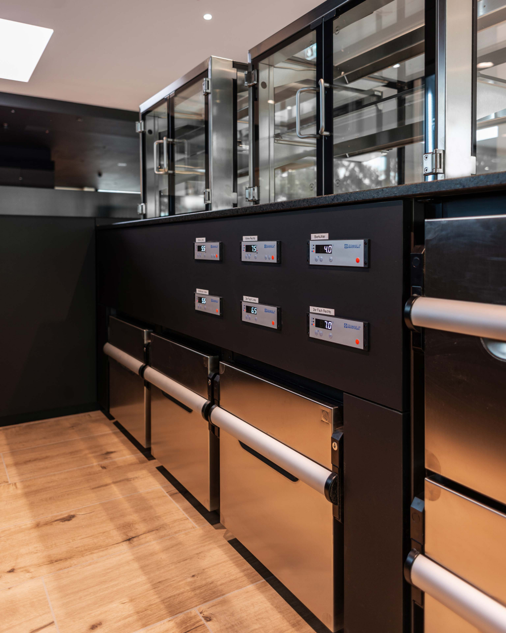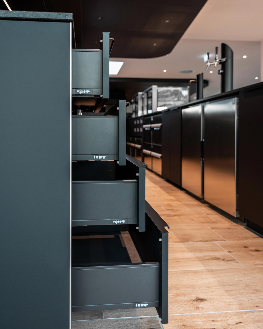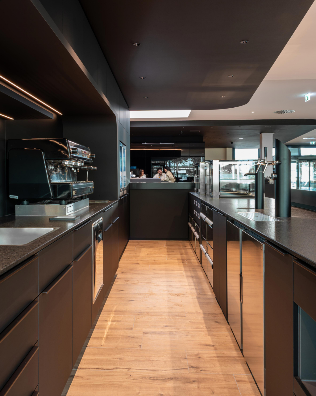 Hinter der Ästhetik steckt jede Menge Funktion: Stauraum, Kühltechnik, Gastrogeräte – alles ergonomisch geplant, leicht zugänglich und so integriert, dass der Ablauf im täglichen Betrieb reibungslos läuft. Die dazugehörige Catering-Küche ist ebenfalls Teil unseres Auftrags gewesen und rundet das Gesamtkonzept ab.