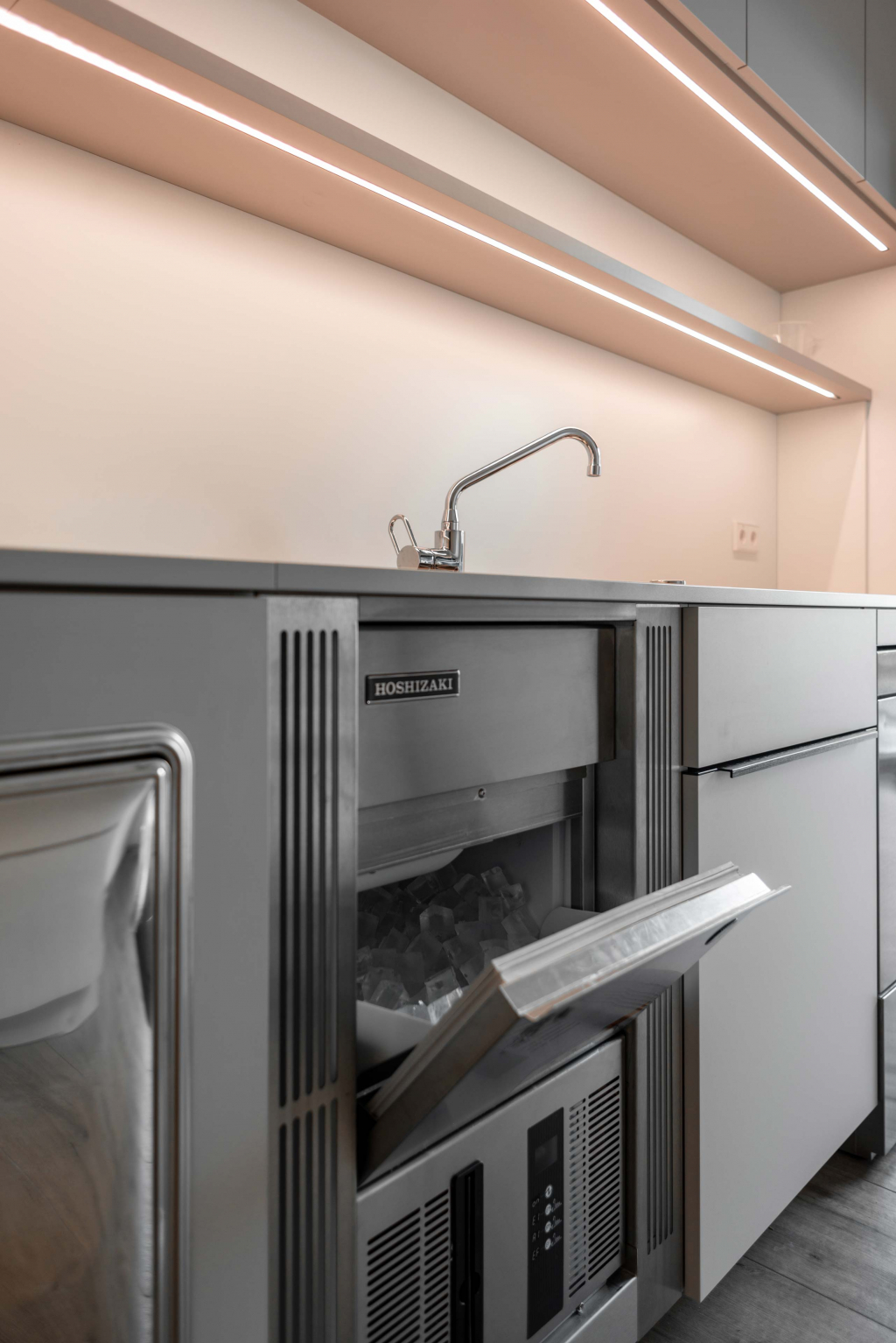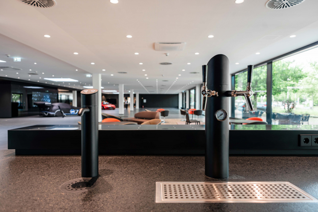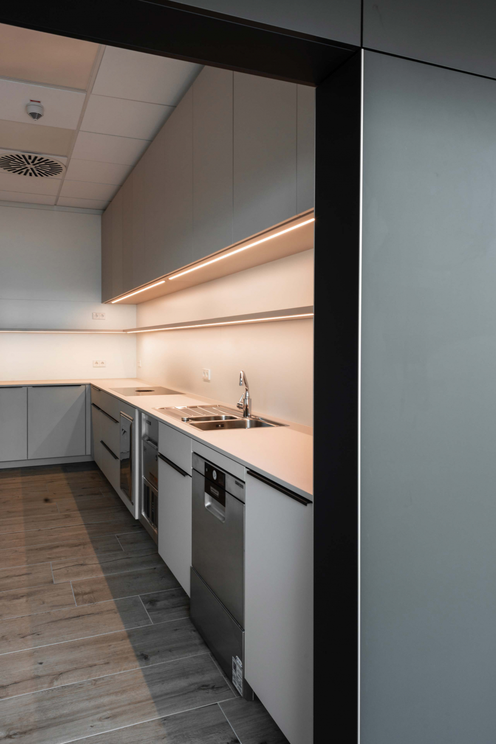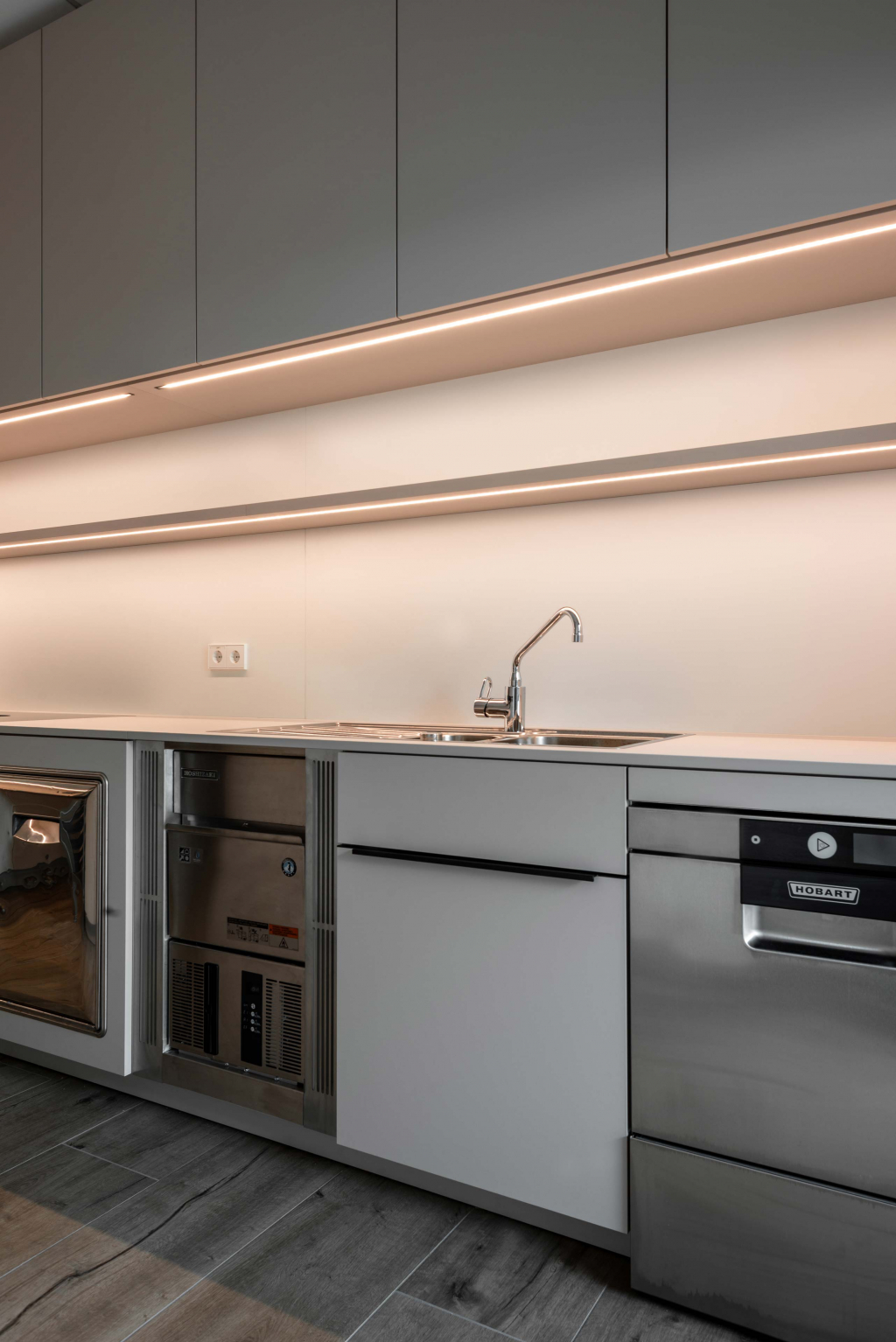Hinter der Ästhetik steckt jede Menge Funktion: Stauraum, Kühltechnik, Gastrogeräte – alles ergonomisch geplant, leicht zugänglich und so integriert, dass der Ablauf im täglichen Betrieb reibungslos läuft. Die dazugehörige Catering-Küche ist ebenfalls Teil unseres Auftrags gewesen und rundet das Gesamtkonzept ab.