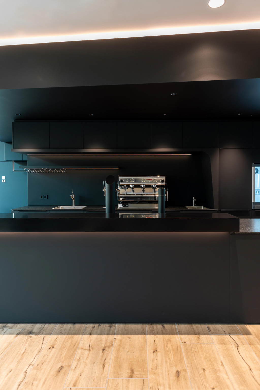 Die Anforderung war klar: schwarz matt, schwarz glänzend – und bitte mit Charakter. Entstanden ist eine Thekenanlage, die sich nicht in den Vordergrund drängt, aber Eindruck hinterlässt.