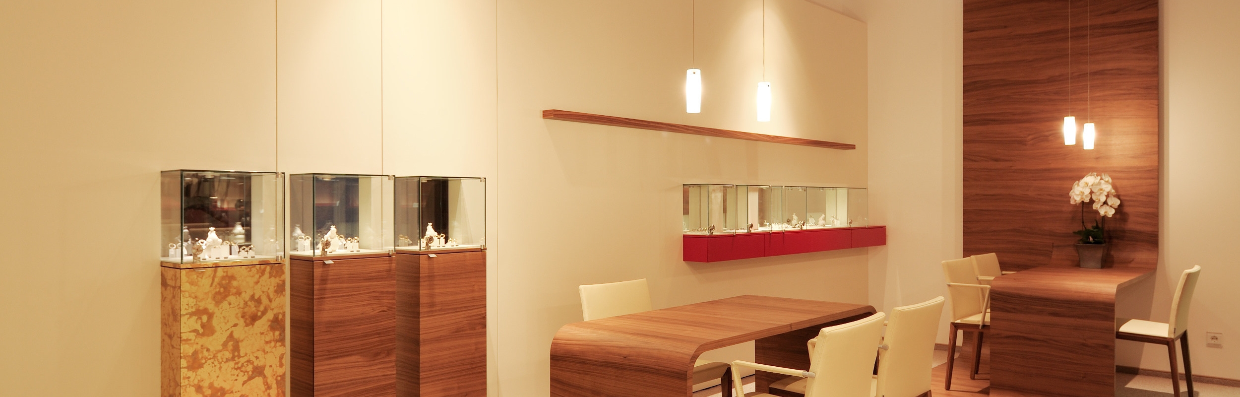 Ein eigenes Geschäft nur für Trauringe? Ja und was für eins, die Glücksschmiede in Endingen ist ein richtiges Highlight in der historischen Altstadt und der perfekte Rahmen für angehende Eheleute um den passenden Ring für den Bund des Lebens zu finden. Einheimischer Nussbaum, Gold, Glas und ein bisschen Rot bilden den Materialmix mit Bezug zu den Produkten die hier präsentiert und verkauft werden. Wie perfekt anliegende Ringe ziehen sich zwei Nussbaumbänder, weich und scheinbar nahtlos vom Boden über die Wand bis an die Decke. Drei Beratungsplätze und die Kassentheke sind Teil dieses Bandes und bieten, perfekt integriert, genug Platz für Produkte und die notwendige Kassentechnik. Becherer – Partner für Ihren Erfolg.