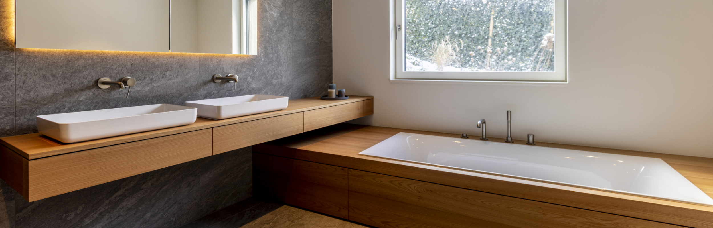 Ein Bad mit einer großzügigen Badewannenverkleidung, umspielt von an Meeresgrund erinnernde Fliesen. Holzart: Eiche leicht geweist und gebürstet. Ein wandhängendes Sideboard mit funktionalem Stauraum, und zwei indirekt beleuchteten Spiegeln. Eher untypisch: das Sideboard abgelöst vom Waschbecken, das als Solitär komplett aus Stein gefertigt daneben seinen Platz findet. Im zweiten Bad kontrastiert die gebürstete Rüster, mit ihrer tollen Maserung und Struktur sehr harmonisch mit den grauen Natursteinfliesen. Auch hier umspielt eine großzügige Verkleidung die emaillierte Wanne von Bette und lädt zu einem wohltuenden Vollbad ein. Großzügige Schübe integriert im Unterbau sorgen für reichlich Stauraum.