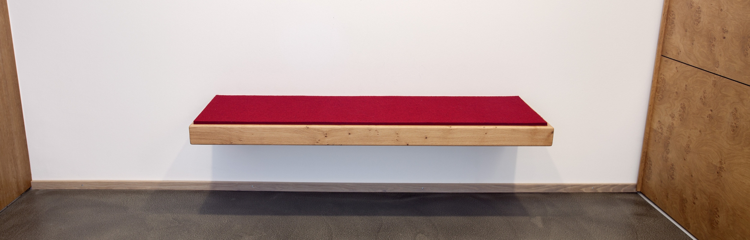 Kiss from a rose … Wie ein roter Faden zieht sich die Roseneiche durch die Einrichtung in diesem modernen Neubau in Freiburg. Als natürlicher und warmer Kontrast sorgt sie in der hellen, klaren Architektur für ein warmes, wohnliches Raumgefühl. Ein offener Eingangsbereich, großzügig und funktional, die Schiebetüren verbergen einen großen Stauraum für Garderobe und Schuhe.