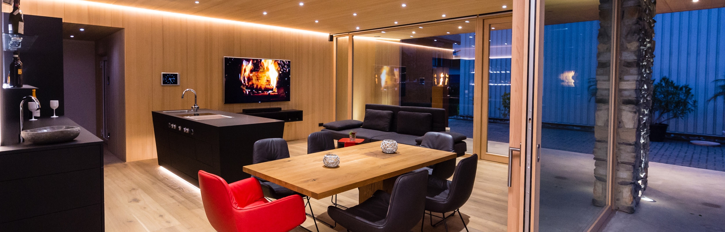 Tagsüber zurückhaltend entfaltet der Gartenpavillion bei Nacht seinen vollen Glanz. Der Holzbau aus schlichter Weißtanne und großzügigen Glasflächen wird im Inneren kombiniert mit schwarzen Möbeln und einem prismenförmig gearbeitetem Küchenblock als zentrales und prägendes Element.