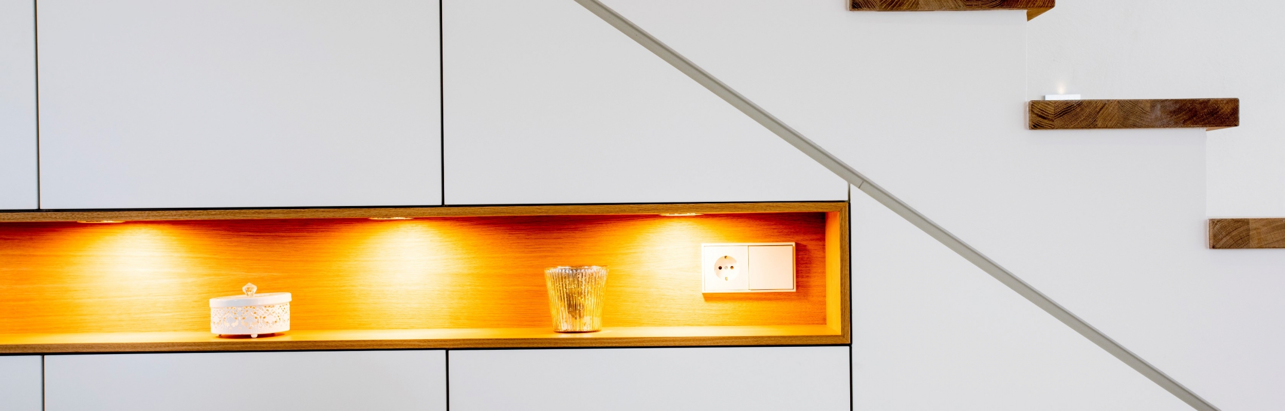 Offene Räume, fließende Übergänge von der Schreinerküche über den Essbereich bis ins Wohnzimmer einer jungen Familie. Die Einbaumöbel sind hier nicht nur funktional und zeitlos gehalten, sie übernehmen auch raumtrennende Funktionen d.h. zum einen als Wand zum Kellerabgang und gegenüberliegend zum ‘versteckt-liegenden’ Vorratsraum;